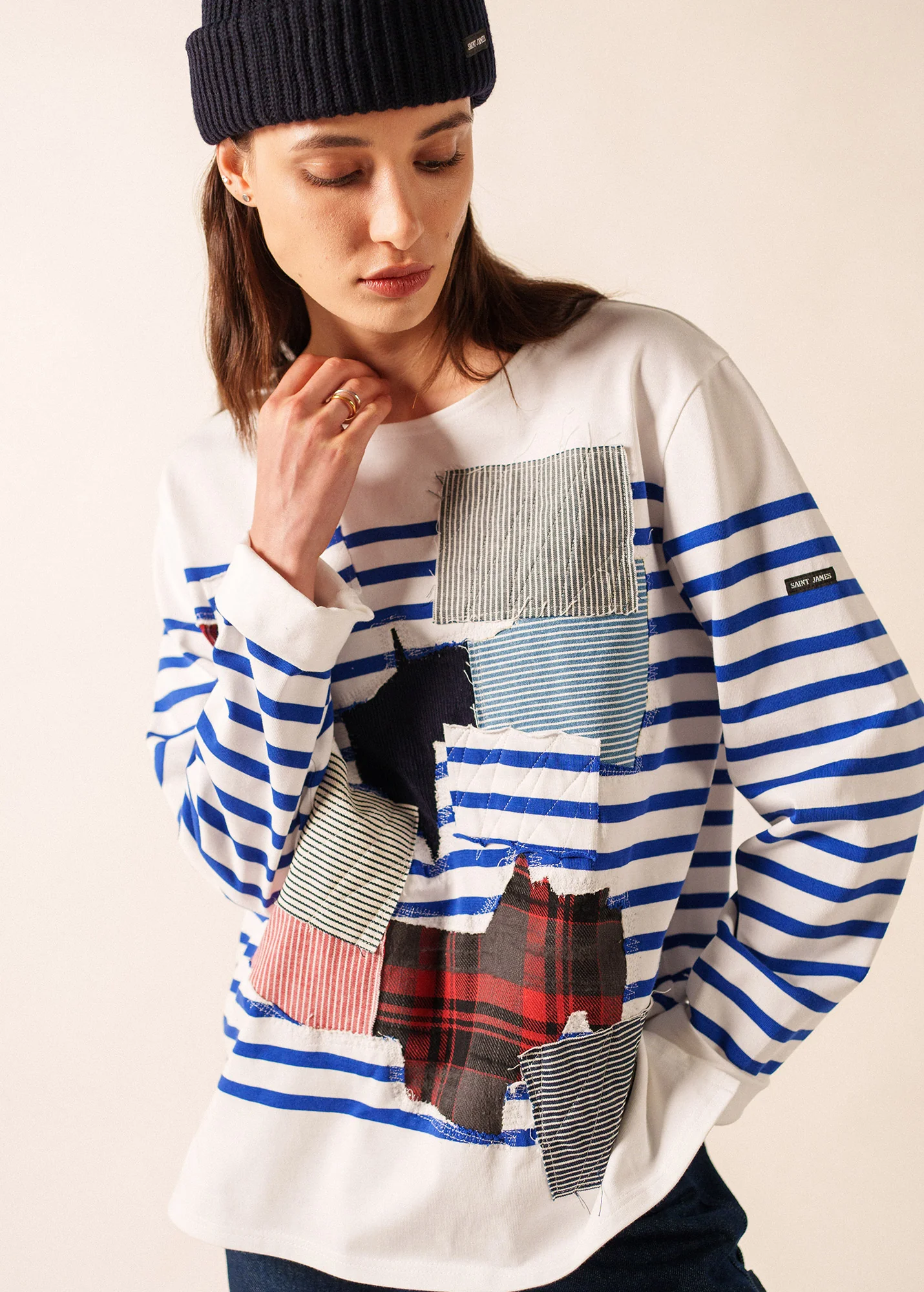 Junya Watanabe poursuit son exploration du patchwork : sur la marinière SAINT JAMES, il s’exprime sur le devant comme une composition graphique, presque picturale. Chaque élément semble raconté, assemblé, pensé pour créer du relief et du rythme, tout en préservant la rigueur et la sobriété de cette pièce iconique. La marinière devient alors plus qu’un vêtement : une pièce manifeste, à la croisée du savoir-faire et de la création.